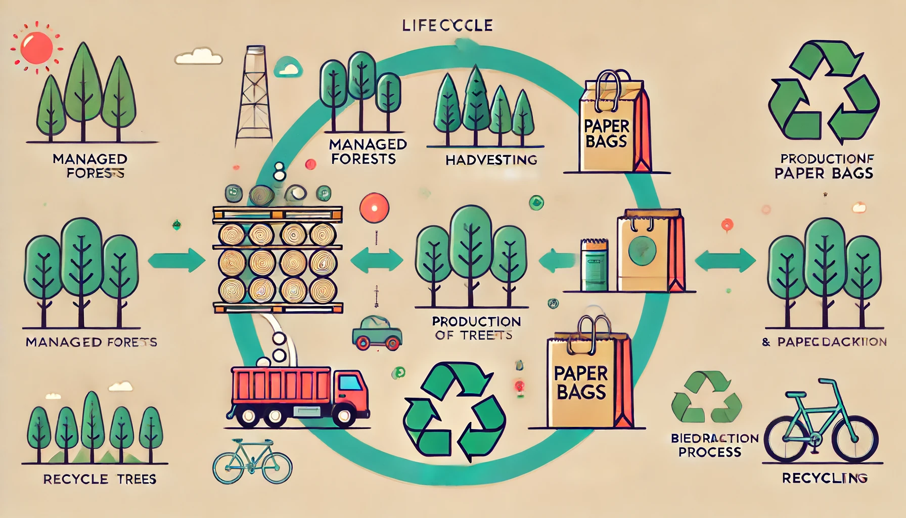 إنتاج الأكياس الورقية له بصمة كربونية أصغر. تتم إعادة زراعة الغابات المدارة المستخدمة لإنتاج الورق. وهذا يساعد على امتصاص ثاني أكسيد الكربون، والتخفيف من آثار تغير المناخ.
